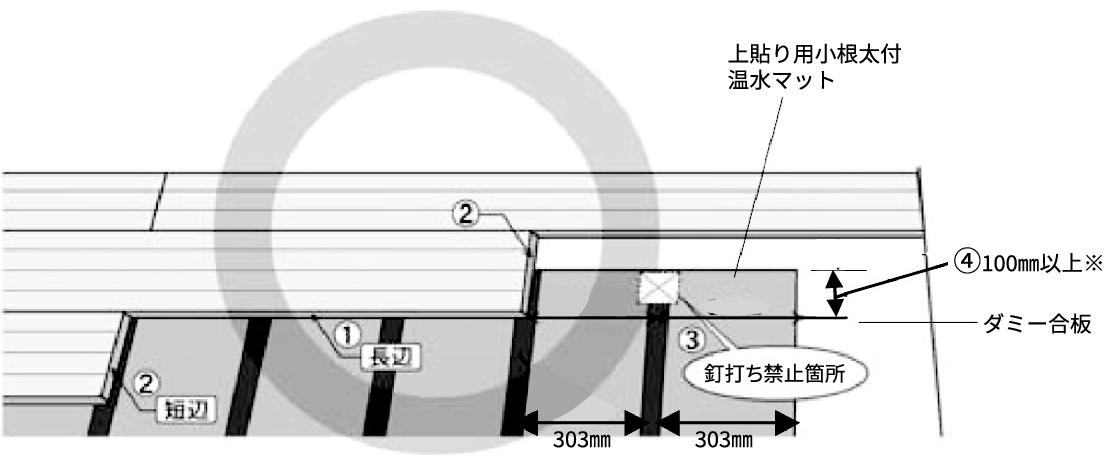 ※フロアの継ぎ目が釘打ち禁止箇所に来る場合は、小根太に釘が打てる様に割り付け位置を調整してください。(上記「施工のポイント」をご参照ください。)