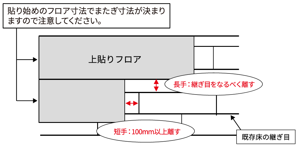 上貼りフロアの継ぎ目と既存床の継ぎ目が、短手は100mm以上離して割り付け、