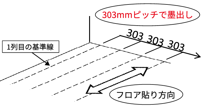下図のように1列目フロアの墨出し(基準線)を行い、その線からフロアを貼る方向と平行に、303ピッチで墨出しをしてください。